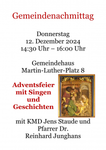 Zu dem adventlichen Gemeindenachmittag laden wir ganz herzlich ein. Unser Kantor Herr